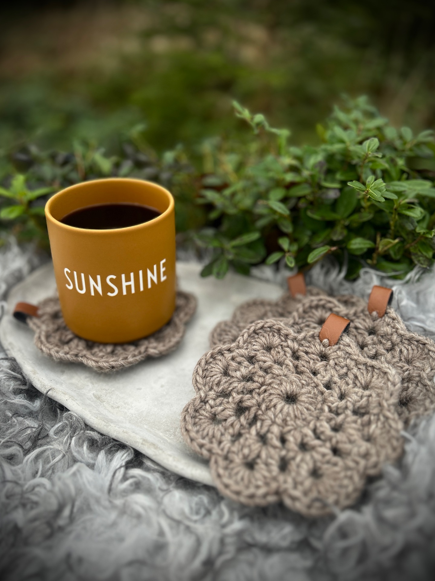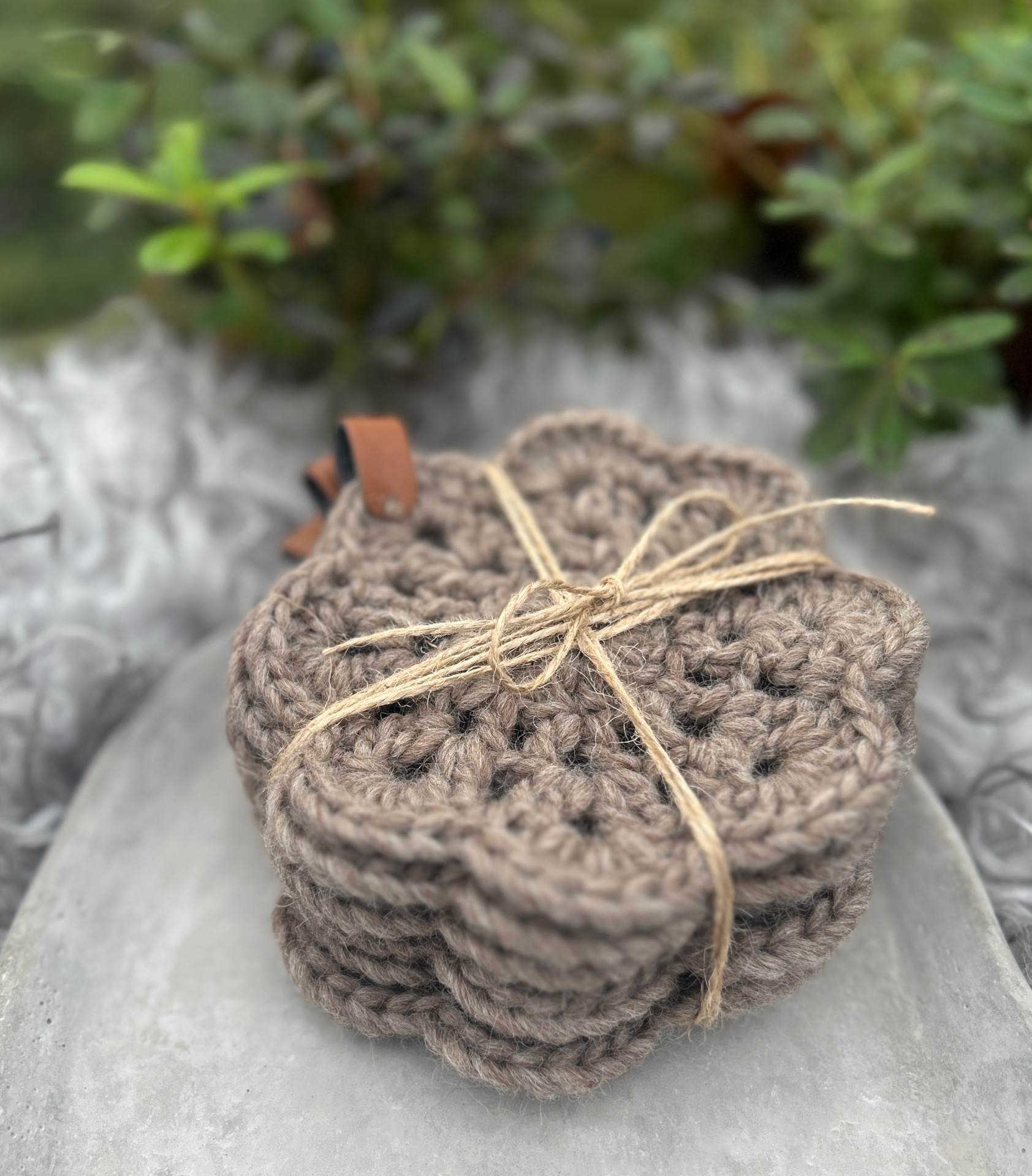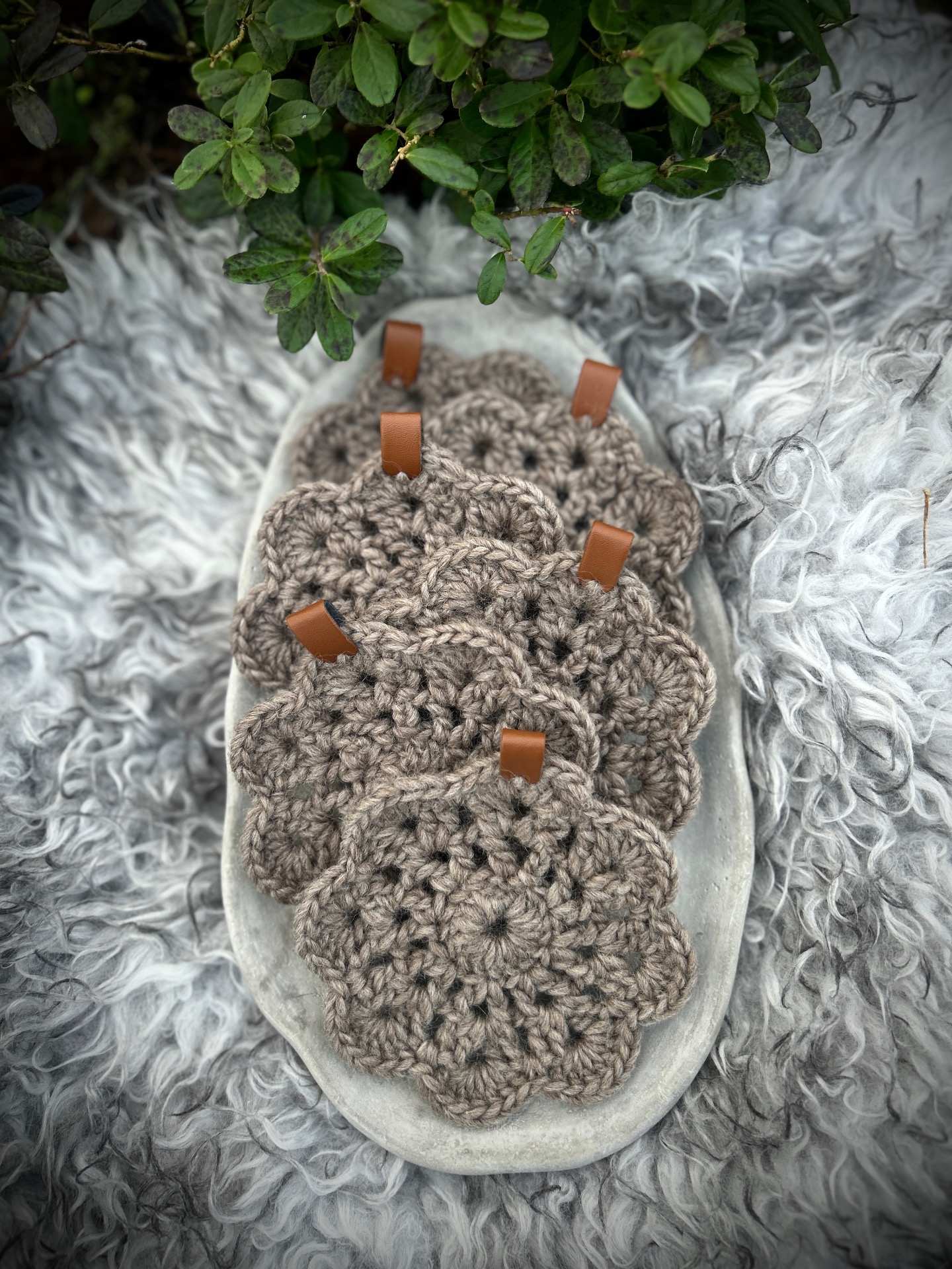 Virkade mugg/glas underlägg100% Ull Detalj av läderimitation Innehåller 6 st underlägg